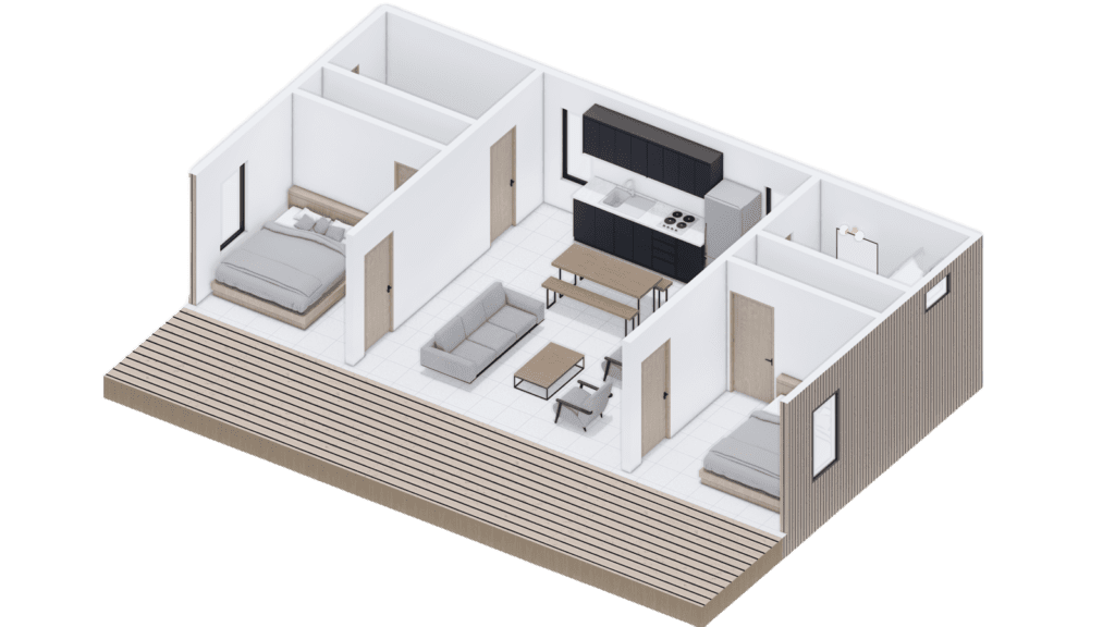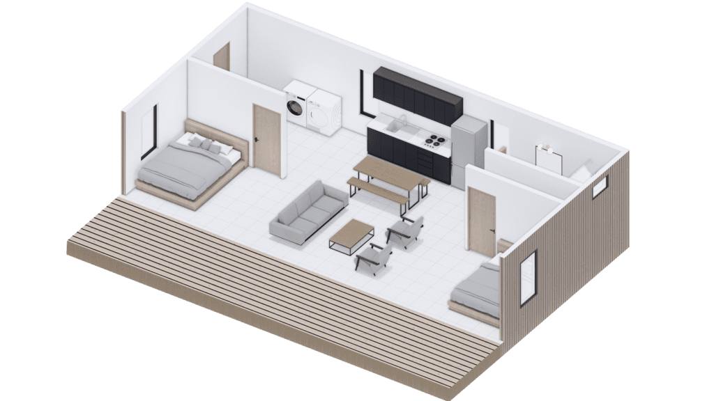 Spanning an impressive 20′ x 40′, the Valleyview is ideal for families or groups of friends seeking a perfect getaway. Its spacious open to outside central gathering area is destined to become the focal point of your stay, while the bedrooms offer breathtaking nature views that are simply unmatched.