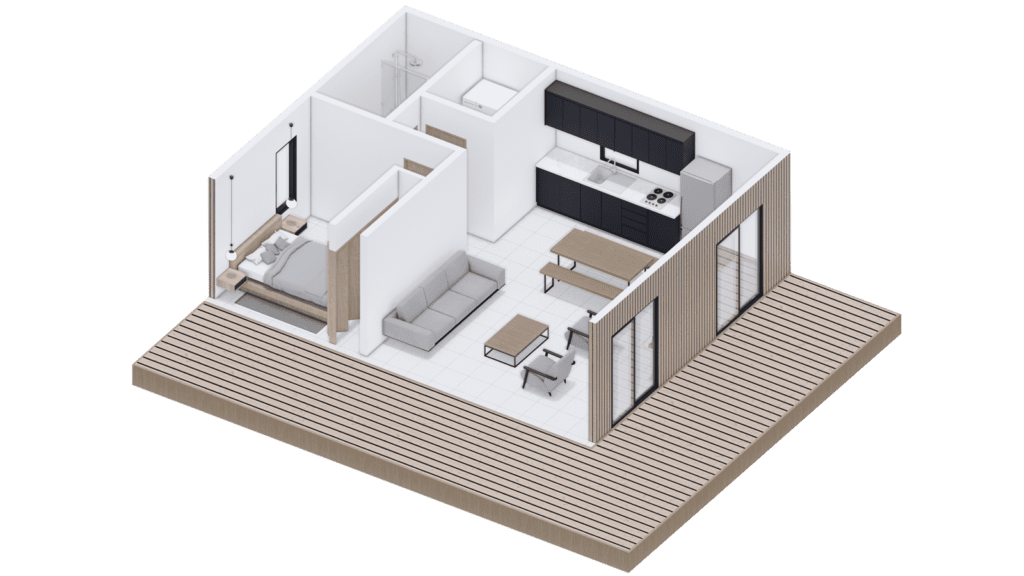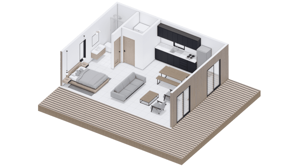 Measuring at 28′ x 22′, the Waterside offers an ideal escape from the ordinary hustle and bustle. With its expansive picture windows gracing the living room, it bathes the space in incredible light while framing your cabin perfectly for panoramic views of the surrounding natural landscapes.