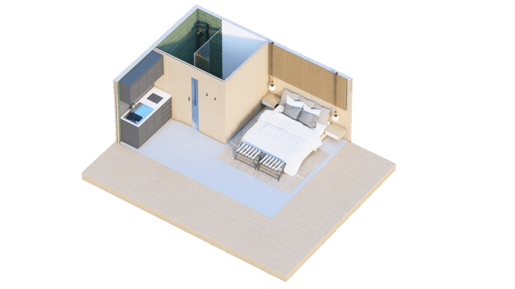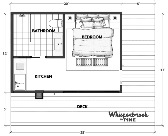 Measuring 12′ x 20′, the Whisperbrook cabin strikes a balance between affordability and sophistication, boasting lofty ceilings and an expansive open-concept design. Complete with a well-appointed kitchenette and a bathroom exuding luxury, this space is an ideal choice for a romantic couples’ escape or as a sought-after vacation rental destination.